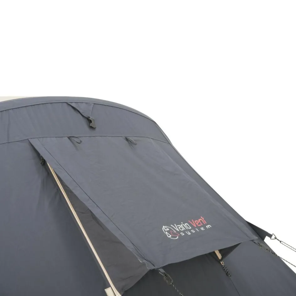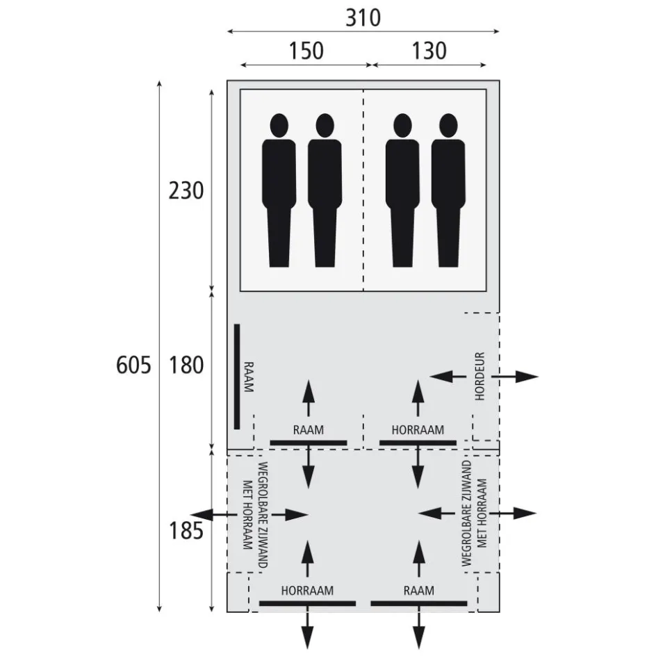 Voor de leefruimte ligt een royale, afsluitbare luifel (ca. 185 x 310 cm) met combiwand. U kookt of zit hier beschut, terwijl de wegrolbare zij-ingangen met horramen prettig doorluchten. De leefruimte zelf (ca. 180 x 310 cm) heeft een extra brede voordeur en een zij-ingang, waardoor u uw indeling flexibel houdt. Met een stahoogte tot 225 cm voelt de tent ruimtelijk aan en beweegt u zich makkelijk.