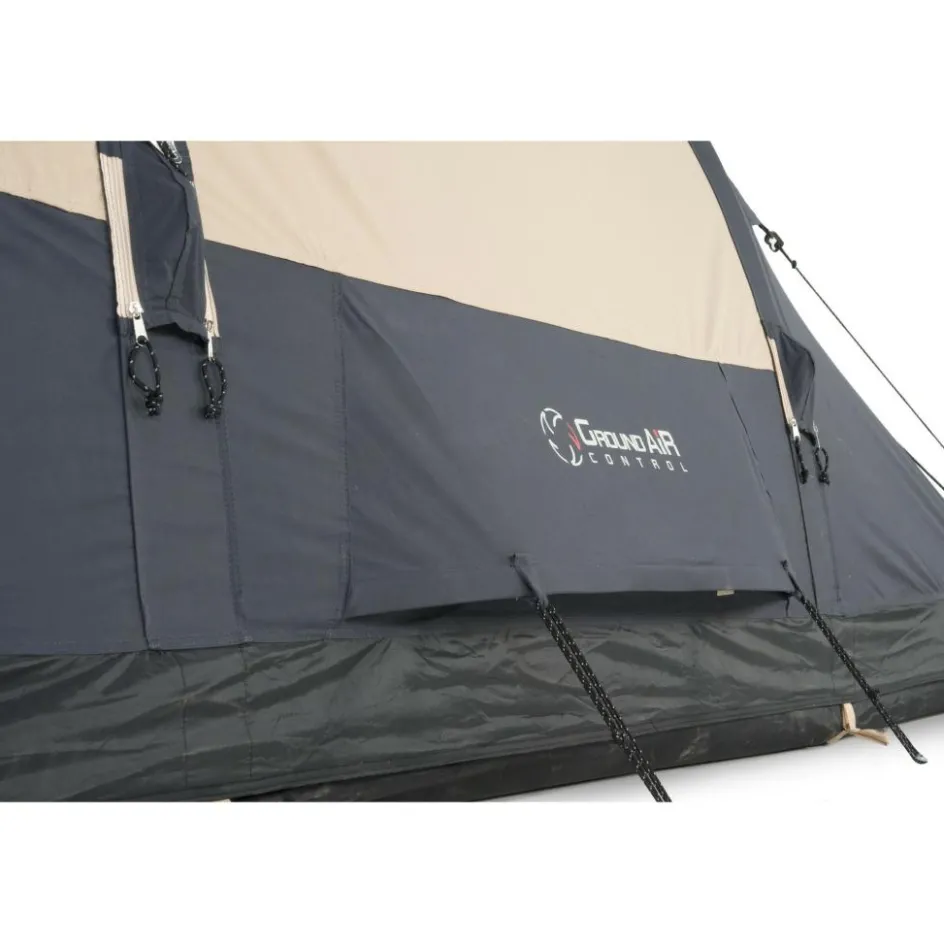 Het vaste grondzeil is van sterk Oxford polyester. Met een waterkolom van 5.000 mm blijft de vloer droog bij nat weer, terwijl het ingestikte (vaste) ontwerp tocht, insecten en vuil buiten houdt. Zo blijft de leefruimte schoon en loopt u niet over opstaande randen.