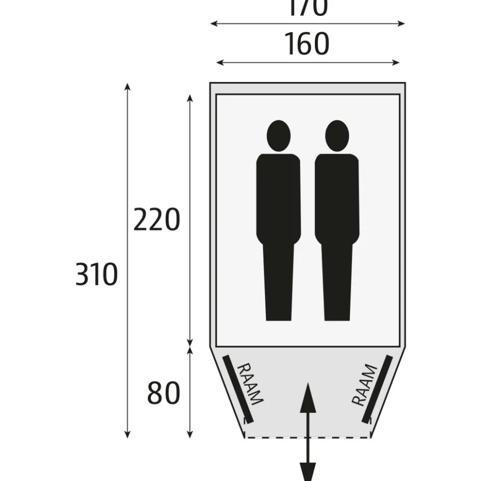 De Cortina 170 RSTC heeft één slaapcabine voor twee personen (220 x 160 cm). Met de 220 cm lengte ligt u ontspannen, ook als u wat langer bent, en blijft er plek voor een kussen en kleine spullen aan het voeteneinde. Voor de cabine ligt de leefruimte (80 x 160 cm): ideaal voor tassen, schoenen en een droge instap bij regen. De voorkant is 100 cm hoog voor vlot in- en uitstappen, terwijl de 120 cm middenhoogte binnen voldoende bewegingsruimte geeft. Inclusief haringen, reflecterende scheerlijnen en draagtas, zodat u direct compleet bent.
