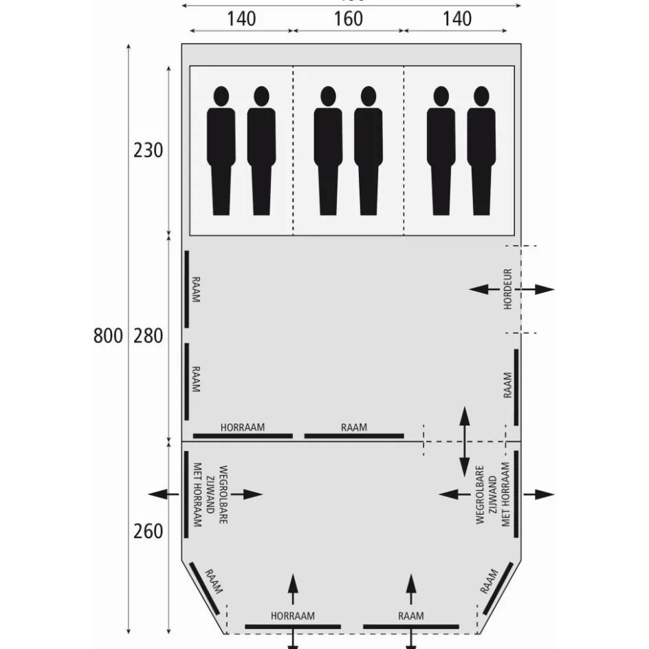 De Royal Prestige 460 RSC is 800 x 460 cm en biedt een ruime leefruimte van 280 x 460 cm met rechte wanden, waardoor kasten, tafel en keukenblok eenvoudig passen. De vaste luifel van 260 x 460 cm is afsluitbaar en geeft u een droge, schaduwrijke plek om te koken of te ontspannen, terwijl u bij regen niet meteen de binnentent nat loopt.