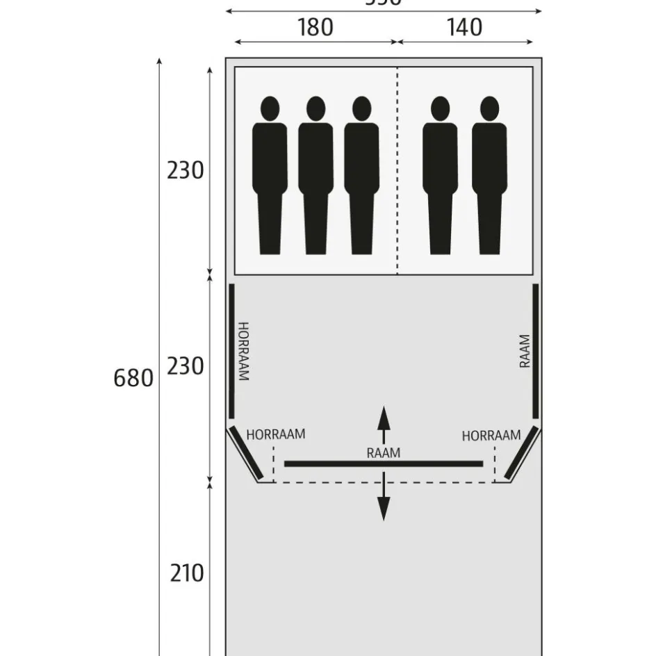 Met een leefruimte van 230 × 350 cm heeft u binnen plek voor een tafel, stoelen en een keukenblok, terwijl de rechte wanden de bruikbare ruimte maximaliseren. De twee slaapcabines (230 × 180 cm en 230 × 140 cm) bieden plaats aan maximaal 5 personen; denk aan een 3+2 indeling voor gezinnen. Dankzij de wegritsbare scheidingswand bepaalt u zelf of u één royale slaapkamer of twee aparte cabines wilt. Horrengaas in de slaapcabines en op de deuren houdt insecten buiten en laat frisse lucht binnen. De achterkant is 175 cm hoog, met 225 cm stahoogte in het midden en voorin, zodat u zich overal gemakkelijk kunt bewegen.