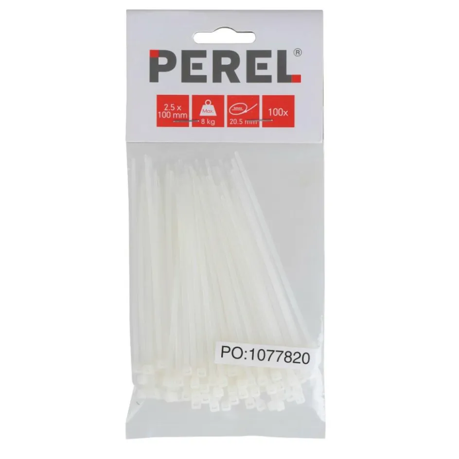 Deze Perel tie-wraps zijn ideaal te gebruiken om iets te bevestigen of stevig vast te binden. De tie-wraps hebben een transparante kleur. Een tie-wrap heeft een lengte van 100 millimeter en een breedte van 2,5 millimeter. De Perel tie-wrap transparant worden geleverd per 100 stuks. Aan de tie-wrap kan een maximaal gewicht van 8 kilogram gehangen worden.