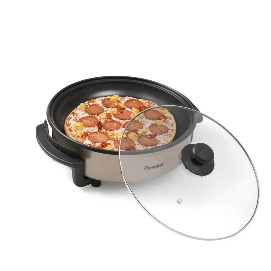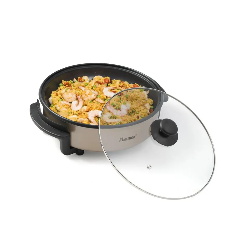 De Bestron AHP1200SAT Multifunctionele hapjespan is ideaal voor het braden- en bakken van uw favoriete gerechten. De extra hoge rand zorgt ervoor dat er niet onverwachts iets uit spat en dankzij de antiaanbaklaag is het gebruik van olie of boter overbodig. De glazen deksel is voorzien van een handige stoomuitlaat en handvat. Tevens is de deksel ook vaatwasserbestendig.