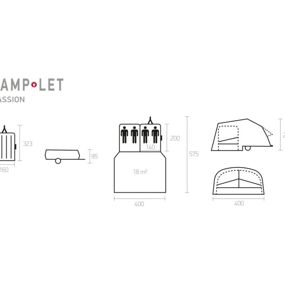 Door het lichtere design van maar 270 kg kan deze vouwwagen achter een kleine auto of een elektrische auto. Daarnaast is de vouwwagen binnen 15 tot 20 minuten met gemak opgezet. Het duurzame materiaal heeft een waterafstotende coating, is uv-bestendig en ademend. De Camp-let vouwwagen heeft een ongeremd ledig gewicht van 270 kg en een geremd ledig gewicht van 295 kg. De wagen is te verkrijgen in ongeremd 500 kg en geremd 500 kg en 750 kg.