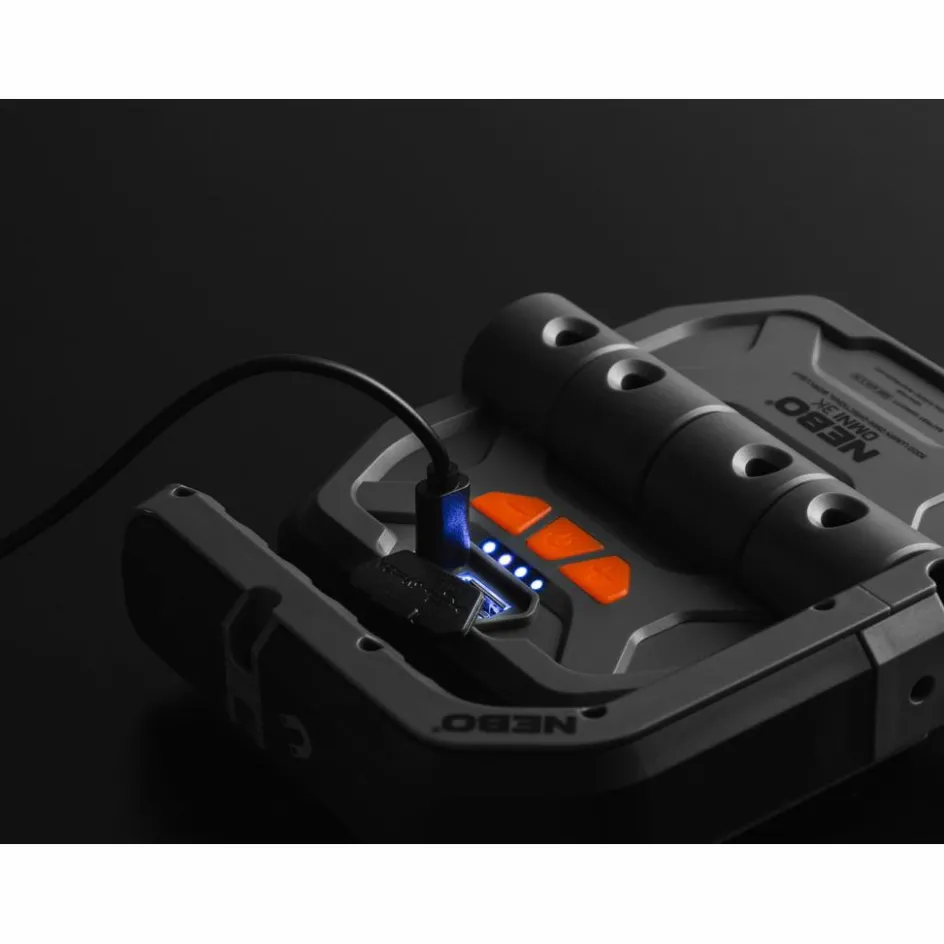 De Nebo Omni 3K is dé ultieme, veelzijdige werklamp met een krachtige output van 3000 lumen dankzij de dual COB-LED. Met een magnetische handgreep en dubbele roterende COB-LED panelen biedt de Omni handsfree, verstelbaar licht precies waar u het nodig heeft. De COB-technologie zorgt ervoor dat vele kleine LED’s samenwerken als één grote LED-chip, wat resulteert in gelijkmatig helder licht. Dankzij de magnetische handgreep hangt u de lamp eenvoudig op aan elk metalen oppervlak, en de handgreep dient ook als handige haak. Hierdoor kunt u de Omni 3K ophangen tijdens gebruik of transport. Omdat de Omni 3K ook gebruikt kan worden als powerbank, bevindt zich aan de achterzijde een geïntegreerde USB-poort voor het opladen van apparaten zoals smartphones of camera’s, wat dubbel handig is wanneer een stopcontact niet in de buurt is. Het opladen van de Omni 3K gebeurt via een USB-C oplaadkabel. Het laadniveau wordt aangegeven door LED’s boven de oplaadpoort. De werklamp is IPX4 spatwaterdicht en wordt geleverd inclusief een handige USB-kabel.