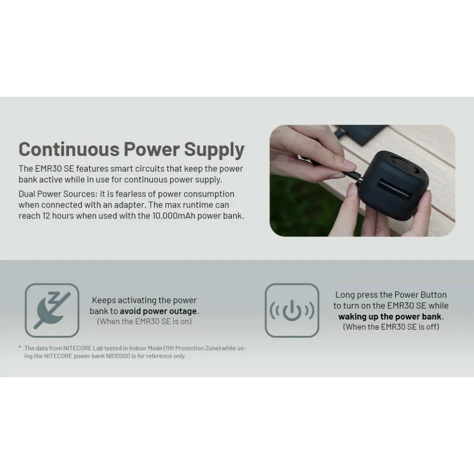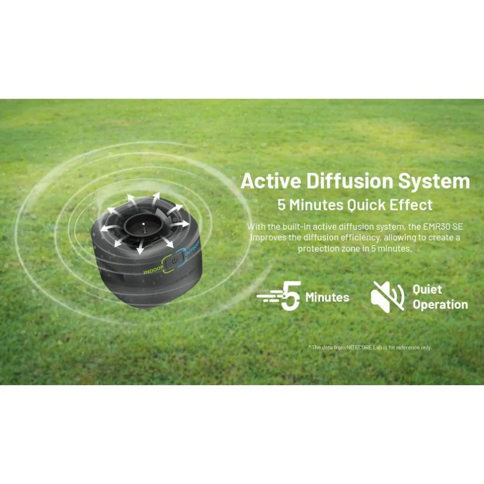 De NITECORE EMR30 SE muggenverjager is compact en met één hand te bedienen. Deze muggenverjager heeft twee standen: een binnenmodus met een bereik van 3,3 meter en een buitenmodus met een bereik van 4,9 meter. Deze muggenjager is licht en verwarmt muggenverjagende matjes met het vernieuwde FCB 2.0 verwarmingssysteem, waarbij de geur wordt verspreid met behulp van een ventilator. Hierdoor is de EMR30 SE zelfs te gebruiken als het een beetje waait. Deze muggenverjager is zeer stil en al effectief binnen 5 minuten. U kunt deze EMR30 SE alleen gebruiken in combinatie met een powerbank (niet inbegrepen). De muggenverjagende matjes zijn los verkrijgbaar en gaan 6 uur lang mee. Verder is deze muggenverjager waterdicht en bestand tegen een val tot 1 meter.