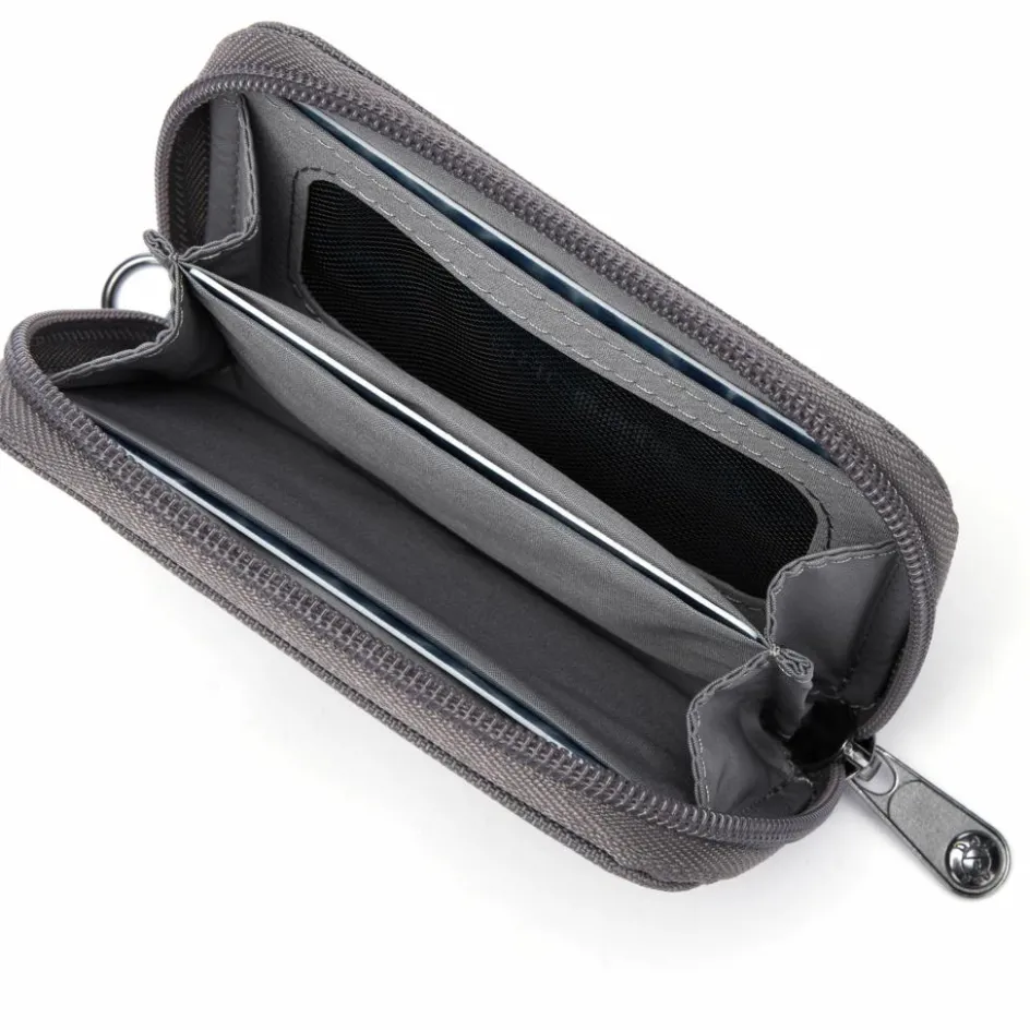 Omdat de RFIDsafe Card portemonnee van Pacsafe gemaakt is met RFID-blokkerende materialen, kunnen uw gegevens niet gescand en gestolen worden. De ring aan de buitenkant is bedoeld om uw portemonnee aan uw tas vast te maken of er een draagriem aan te bevestigen, zodat u hem als schoudertas kunt dragen.