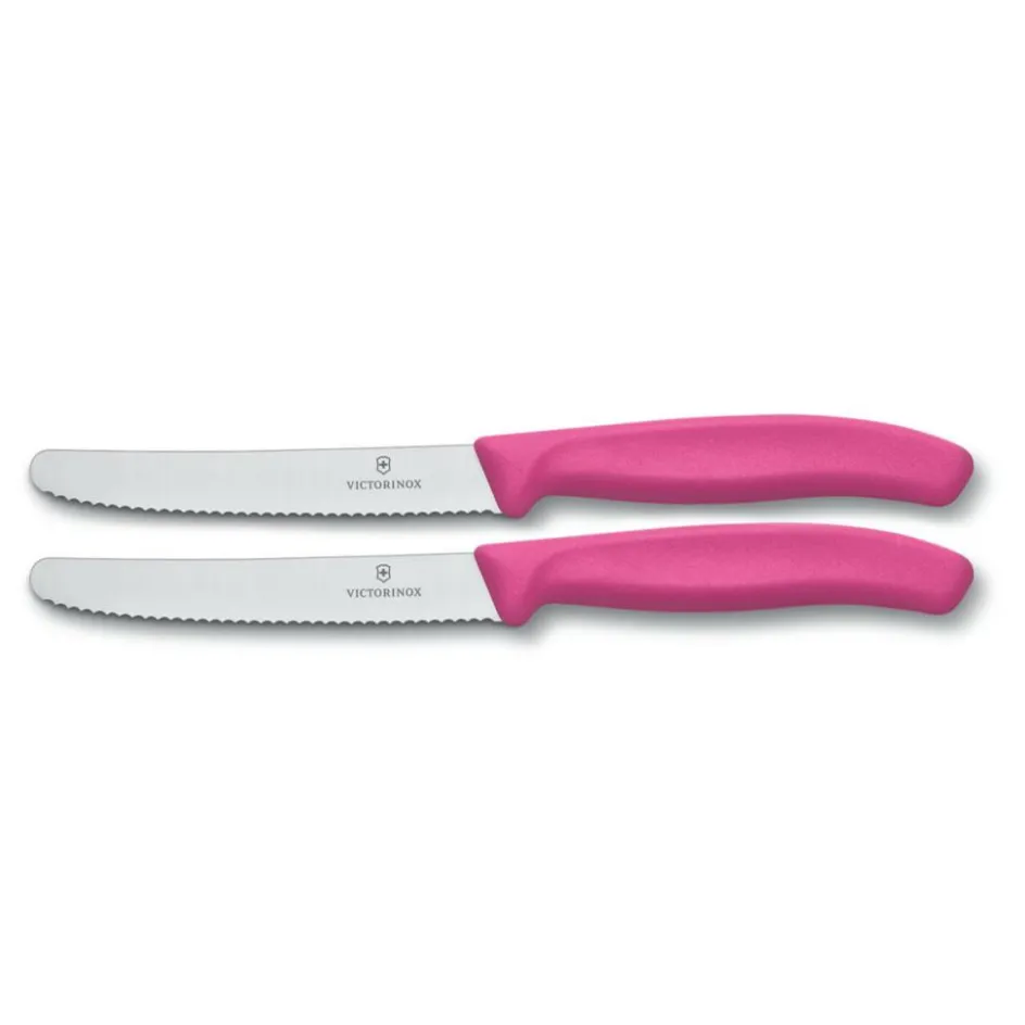 Deze 2 roze tafelmesjes hebben een roestvast stalen lemmet en handvaten gemaakt van polypropeen. Deze mesjes zijn ideaal voor het snijden van wat hardere producten zoals kaas of bijvoorbeeld harde worst. Het lemmet van dit mes is 11 centimeter lang en de onderkant is gekarteld. De tafelmesjes van Victorinox zijn bovendien vaatwasserbestendig.