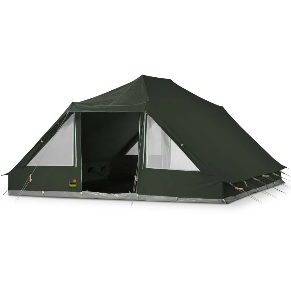 Het doek van deze zeer ruime groepstent is gemaakt van 340 grams stevig Ten Cate katoen. Het inritsbare grondzeil is gemaakt van bisonyl en het sterke frame bestaat volledig uit staal. Deze duurzame materialen kunnen prima tegen een stootje en zorgen ervoor dat u lang van deze tent kunt genieten.
