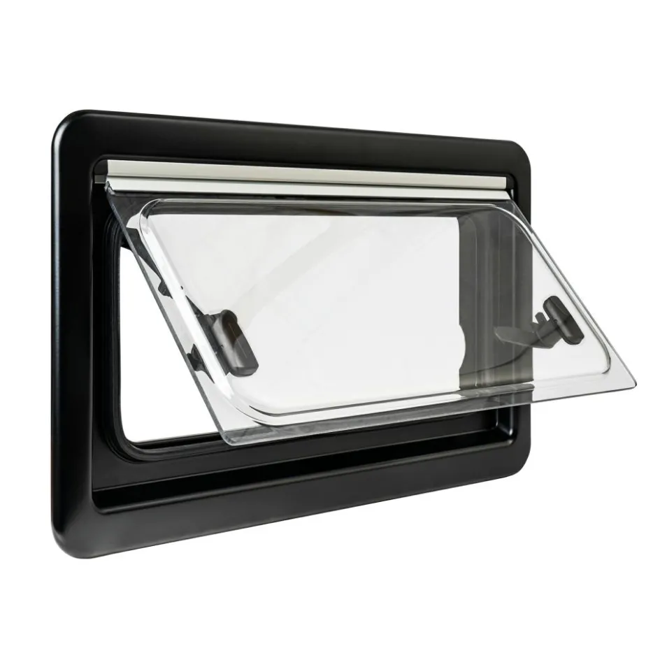 Het raam is geschikt om in te bouwen in campers en caravans met een wanddikte tussen 26 en 41 mm. Dit raam is snel en eenvoudig te monteren en gaat lang mee. Het binnen- en buitenframe zijn aan elkaar geschroefd waardoor deze aan de voertuigwand zijn geklemd. Hierdoor vormt het frame een langdurige en houdbare dichting. Het raam is grijs getint en gemaakt van acryl.