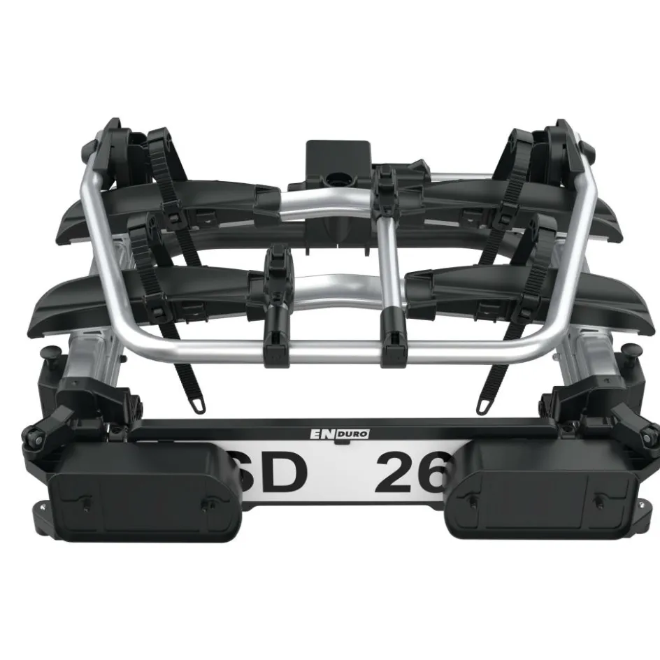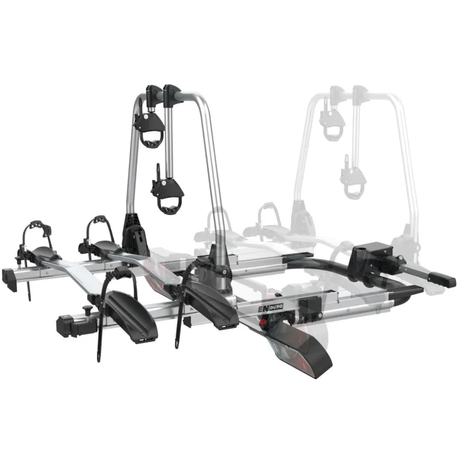 De Enduro SD 260 fietsendrager is speciaal ontwikkeld voor buscampers met achterdeuren. Het uitschuifmechanisme geeft de mogelijkheid om fietsen weg te schuiven, zodat u de achterdeuren gemakkelijk kunt openen. Handig wanneer u onderweg iets uit de bagageruimte wilt pakken. Deze fietsendrager is 70 cm uitschuifbaar, zodat de deuren van de bus met een breedte tot ongeveer 85 cm geopend kunnen worden. Dankzij het snel-koppelingssysteem is de Enduro SD 260 eenvoudig en solide aan te brengen op de trekhaak. De fietsendrager is ook zeer geschikt voor voertuigen met een extreem grote achterklep.