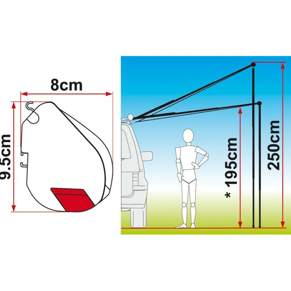 Deze luifel is licht in gewicht en eenvoudig op te zetten. De cassetteluifel kan worden uitgerold en met telescopische spanarmen strak worden opgezet. De luifel is geschikt voor zowel een caravan, minivan of auto en kan makkelijk worden bevestig aan de wand van het voertuig, op het dak op op de imperiaal. De montage adapters zijn los verkrijgbaar.