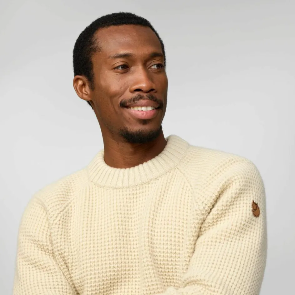 De Fjällräven Övik Waffle Knit trui voor heren is heerlijk zacht en isoleert zelfs wanneer het materiaal een beetje vochtig is. Deze trui van Fjällräven is gemaakt van 100% traceerbaar merinowol, heeft een ronde hals en een kraag, boord en manchetten met ribstructuur.