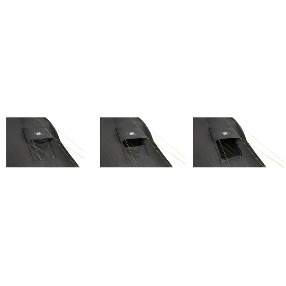 Deze tunneltent is ontworpen om het u op warme en natte dagen makkelijk te maken. De deuren en ramen zijn royaal uitgevoerd met horrengaas en de vier grote ramen zijn verduisterbaar. Dat betekent veel daglicht wanneer u dat wilt en privacy of verduistering zodra het nodig is. Permanente ventilatieopeningen en gaaspanelen in de slaapcabines houden de lucht fris gedurende de nacht, zonder dat u steeds iets hoeft open te zetten.