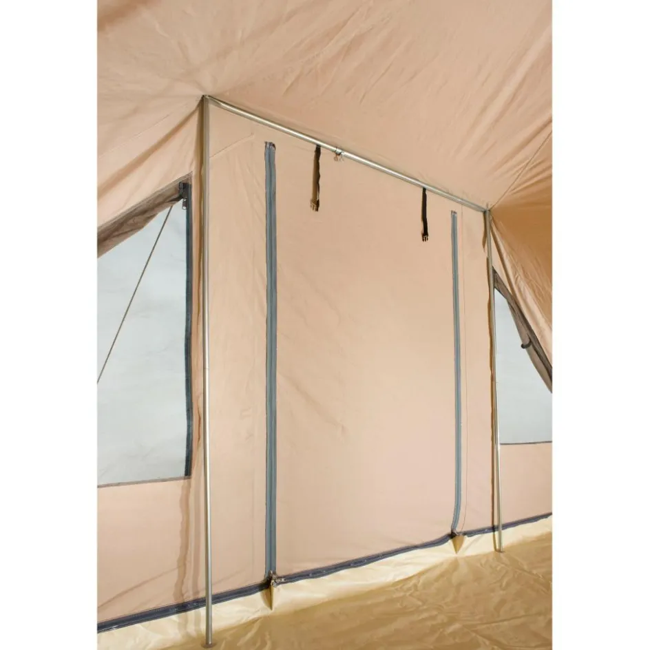 De Nevada XL is gemaakt van hoogwaardig katoen, dat zorgt voor een aangenaam binnenklimaat en uitstekende ventilatie. Het inritsbare grondzeil van bisonyl houdt vocht en vuil buiten, terwijl het stalen frame de tent solide en stabiel maakt. De afwerking met zware YKK-ritsen garandeert langdurige kwaliteit en gebruiksgemak. Uiteraard worden scheerlijnen en haringen meegeleverd, zodat de tent direct klaar is voor gebruik.