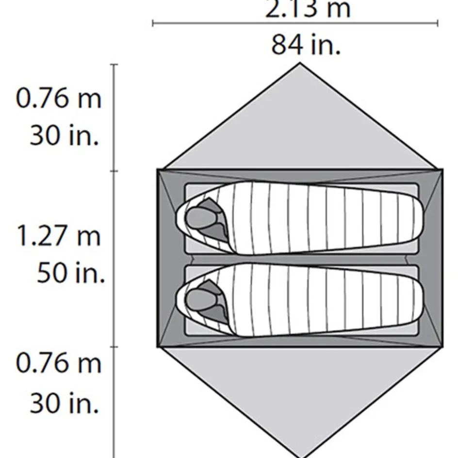 De tent heeft één slaapcabine van 213 x 127 cm en twee gespiegelde ingangen met voortenten. Dat houdt de slaapruimte overzichtelijk en biedt plek voor natte spullen buiten het slaapgedeelte.
