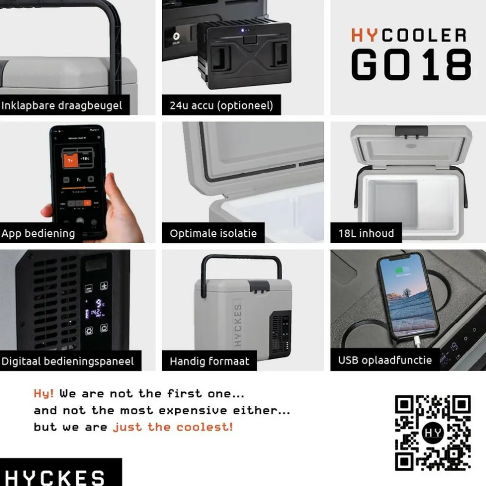 De HyCooler is makkelijk te bediening via het digitale bedieningspaneel. Hierop vindt u de ingestelde en actuele informatie evenals de batterij capaciteit en geavanceerde instellingen. Met de Hyckes app kunt u met een telefoon of tablet de alle functies van de koelbox beheren op afstand. Een geintegreerde USB oplaadpoort zorgt ervoor dat uw mobiele apparaten altijd kunnen worden opgeladen. Er is een mogelijkheid om de koelbox uit te breiden met een 24 uur stand-alone Powerpack accu.
