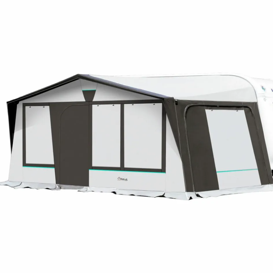 De voorwand bestaat (afhankelijk van de omloopmaat) uit twee of drie uitneembare panelen. Eén paneel heeft ramen, het andere een raam met deur. U kunt de panelen onderling verwisselen om de deurpositie te veranderen. Beide zijwanden zijn uitneembaar en onderling uitwisselbaar en beschikken over een deur en een raam met geïntegreerd muskietennet, zodat u doorwaait zonder insecten binnen te laten. Dankzij de 250 cm diepte heeft u binnen ruimte voor tafel, stoelen en kasten, terwijl de tochtstrook en wielflap de wind onder de caravan tegenhouden voor extra comfort aan de vloerzijde.