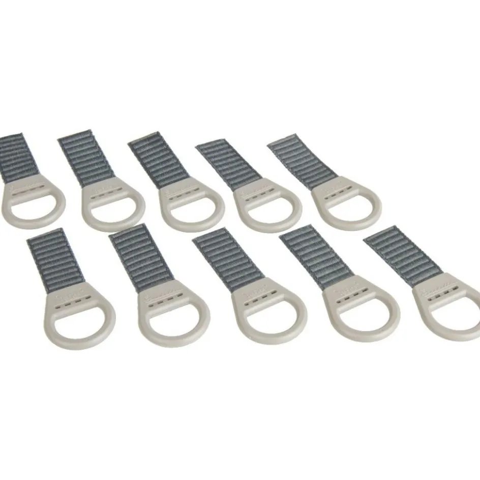 De Isabella D-ring met bevesting voor het gebruik van afspanelastieken wordt geleverd als set van 10 stuks.