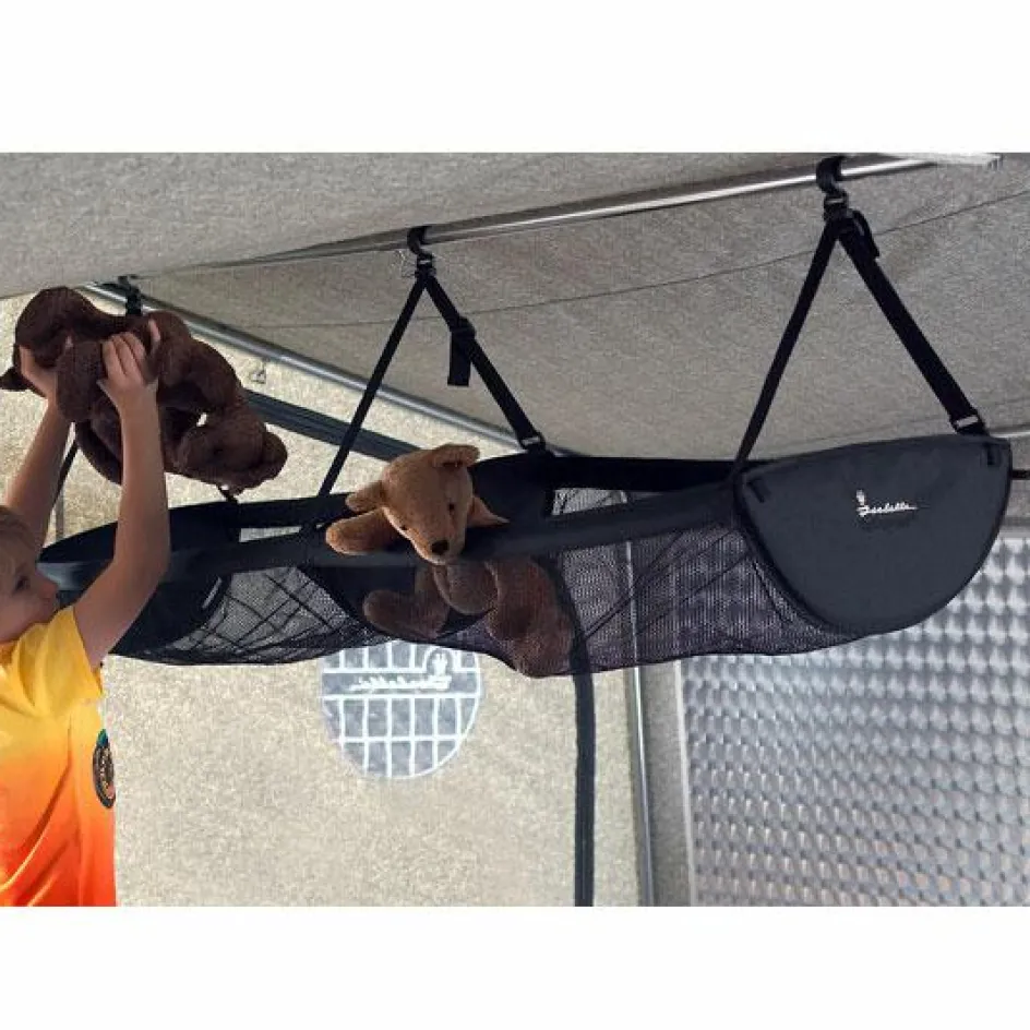 De TopOrganizer kan aan elke dwarsstang bevestigd worden. In de nok, aan de zijkanten of in de uitbouw. Het net hangt aan flexibele haken die aan elke dakstang geklikt kunnen worden. De riemen van het noknet zijn verstelbaar. Daardoor kan de Isabella TopOrganizer altijd horizontaal worden gehangen. Volledig onafhankelijk van de dakligger.
