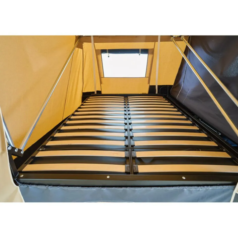 Deze ruime vouwwagen bestaat uit een wagentent met twee slaapcabines, een ruime voortent met luxe keuken en mooie ronde luifel. De slaapcabines zijn extra donker voor beter slaapcomfort en beschikken over twee lattenbodems met schuim matrassen. De luxe keuken in een stijlvolle zwarte kleur is voorzien van een RVS wasbak met elektrische waterpomp-installatie, kraan, thermisch beveiligd 3- pits-gasstel, twee lades en een bestekvak. Bovendien kunt u de keuken gebruiken zonder de vouwwagen uit te klappen. De luifel heeft zijwanden met halfronde ramen.