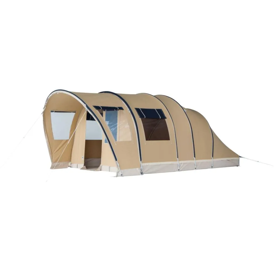 Onder uw voeten ligt een bisonyl kuipgrondzeil met een opstaande rand van 25 cm. Hierdoor blijft de leefruimte schoon, tochtvrij en vrij van ongedierte, ook wanneer het buiten nat is. Het frame met aluminium tentstokken combineert laag gewicht met stijfheid. Dit geeft een solide, windbestendige basis.