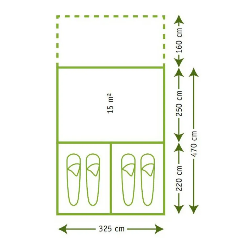 Achterin liggen twee gescheiden slaapcabines van elk 220 x 160 cm. De totale tent meet 630 x 325 cm. Voor de ingang ritst u de luifel van 160 x 325 cm aan voor beschutte buitenruimte en een droge in- en uitstap. Handige details maken het af. Zo zijn aan de zijwanden bevestigingspunten voorzien voor opbergsystemen en laten de ramen aan beide kanten veel daglicht binnen zonder dat het benauwd wordt.
