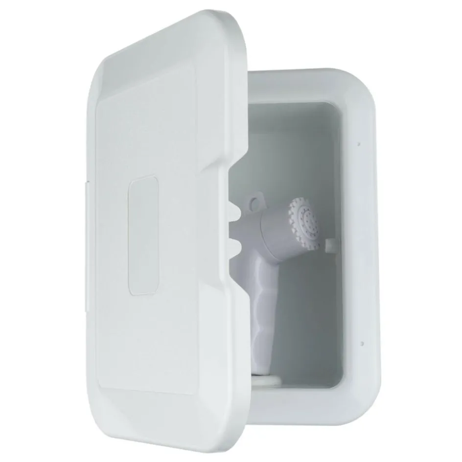 De Nuova Rade buitendouche inbouw koudwater met sproeikop inclusief 5 meter slang is wit met zilveren details. De buitendouche van Nuova Rade heeft een handige slang van vijf meter én een sproeikop. De set heeft de afmetingen van 247 mm bij 186 mm, inclusief klepje.