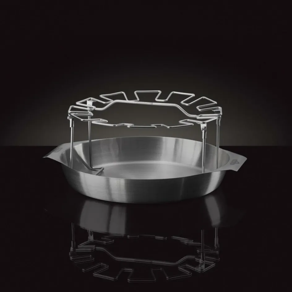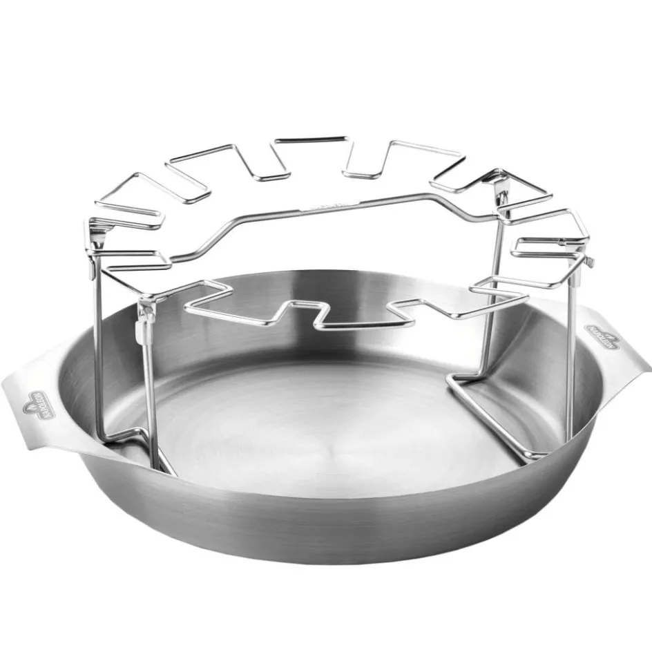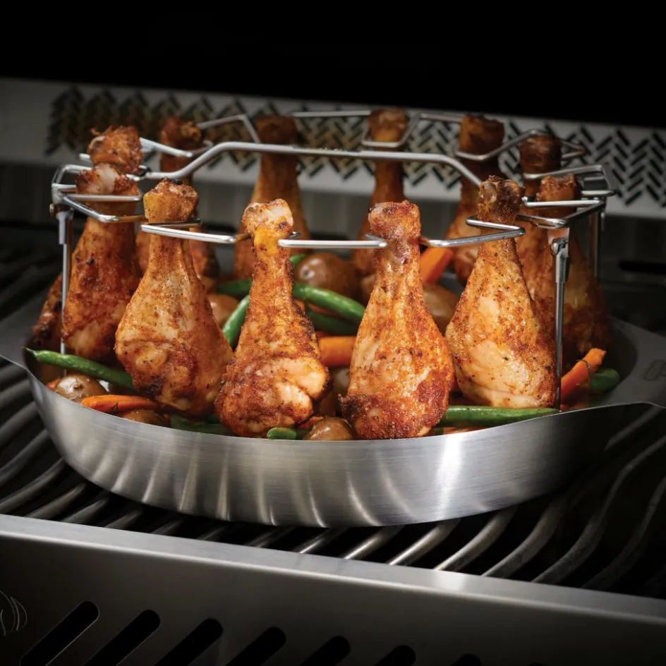 De Napoleon drumstickhouder met schaal is een multifunctionele accessoire om zowel kippenpootjes als eenpansgerechten mee te bereiden. Deze Napoleon drumstickhouder heeft ruimte voor 12 kippenpoten of vleugels en de schaal kan gebruikt worden als lekbak. Ook is het mogelijk om de schaal te gebruiken om bijgerechten apart te bereiden van de kippenpootjes. Doordat het gemaakt is van RVS is het product duurzaam en geschikt voor de vaatwasser. Het rek kan opgevouwen worden en is daardoor gemakkelijk op te bergen.
