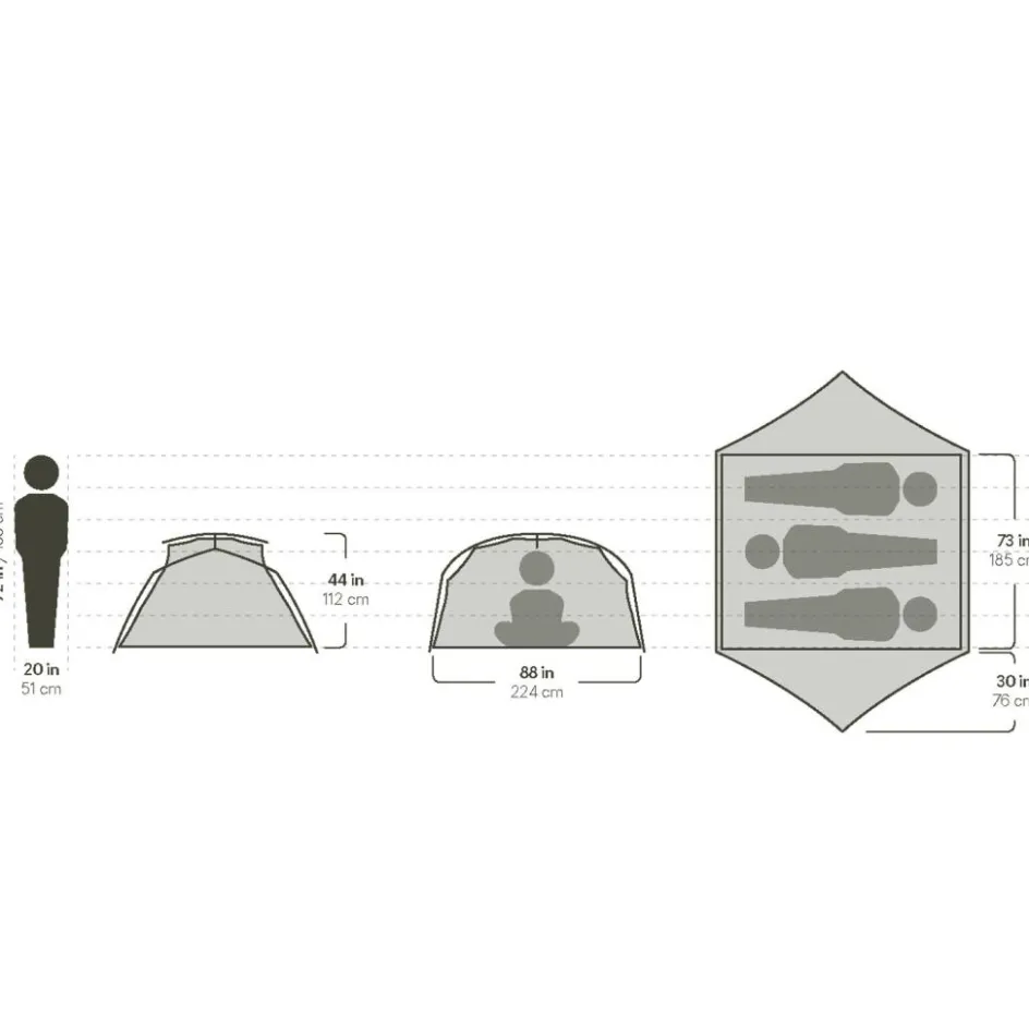 - 3-persoons slaapruimte van 224 x 185 cm: plek voor drie matjes of extra comfort met z’n tweeën.