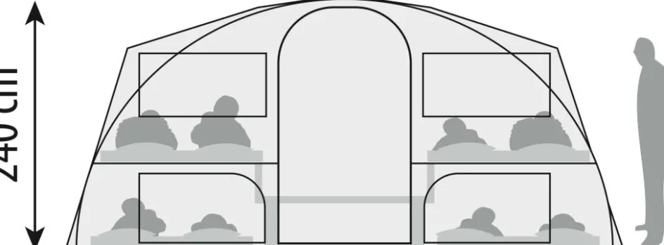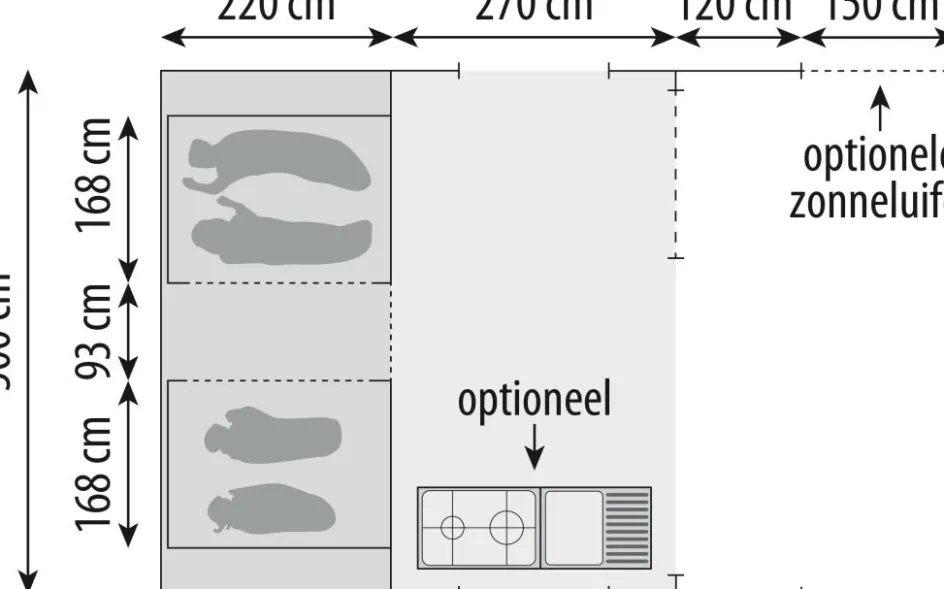 Deze Cabanon vouwwagen heeft slaapplekken voor 4 tot 8 personen. De extra brede bedden van 210 bij 168 zijn voorzien van een dubbele lattenbodem en een comfortabel schuimmatras. Dit in combinatie met de donkere tentdoeken en goede ventilatie zorgt voor een uitstekend slaapcomfort.