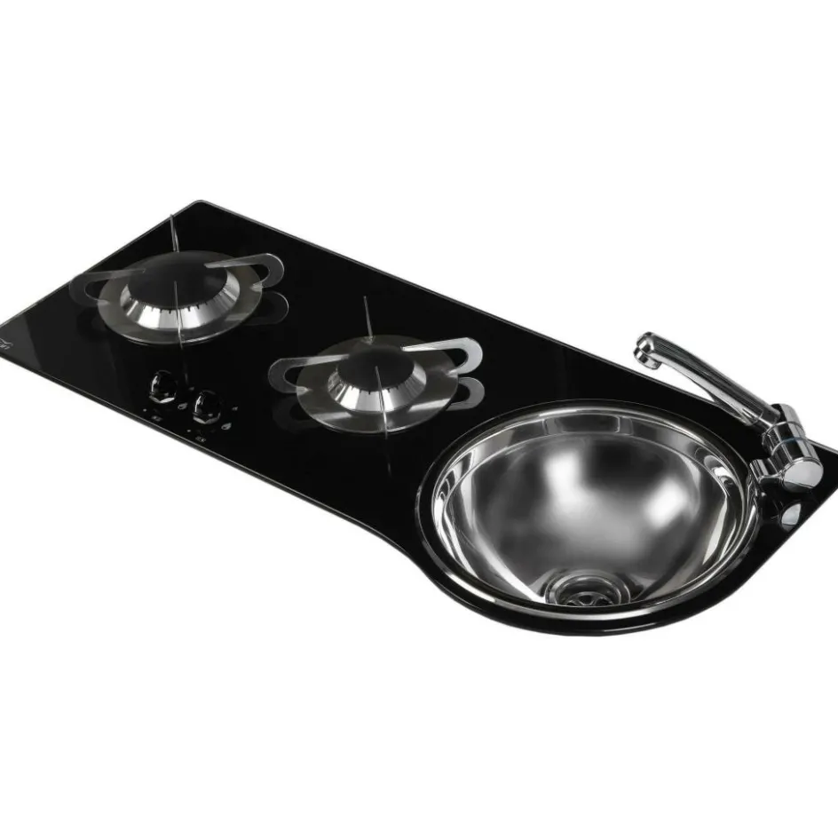 Deze CAN PV1364-S kook-spoelcombinatie rechts heeft twee pitten en een ronde wasbak. De CAN spoelbak is gemaakt van roestvast staal met gehard kristalglas en heeft geen afdekplaat. De twee pitten zijn voorzien van geëmailleerde pitdeksels. Het gat voor de waterkraan heeft een diameter van 33 mm. De spoelbak wordt geleverd exclusief waterkraan en afvoer.