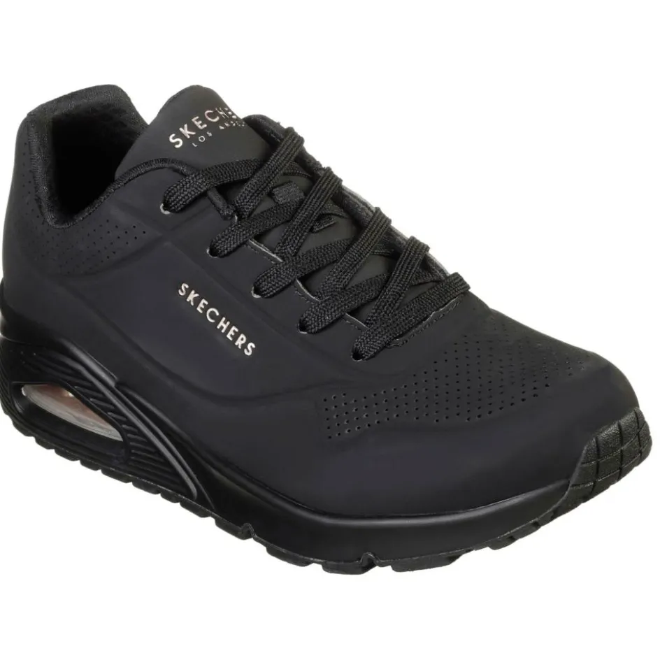 De Skechers Uno – Stand on Air schoenen voor dames hebben een retro uiterlijk en zijn helemaal zwart. De Air Cushioned tussenzool geeft samen met de Air Cooled Memory Foam binnenzool veel comfort.