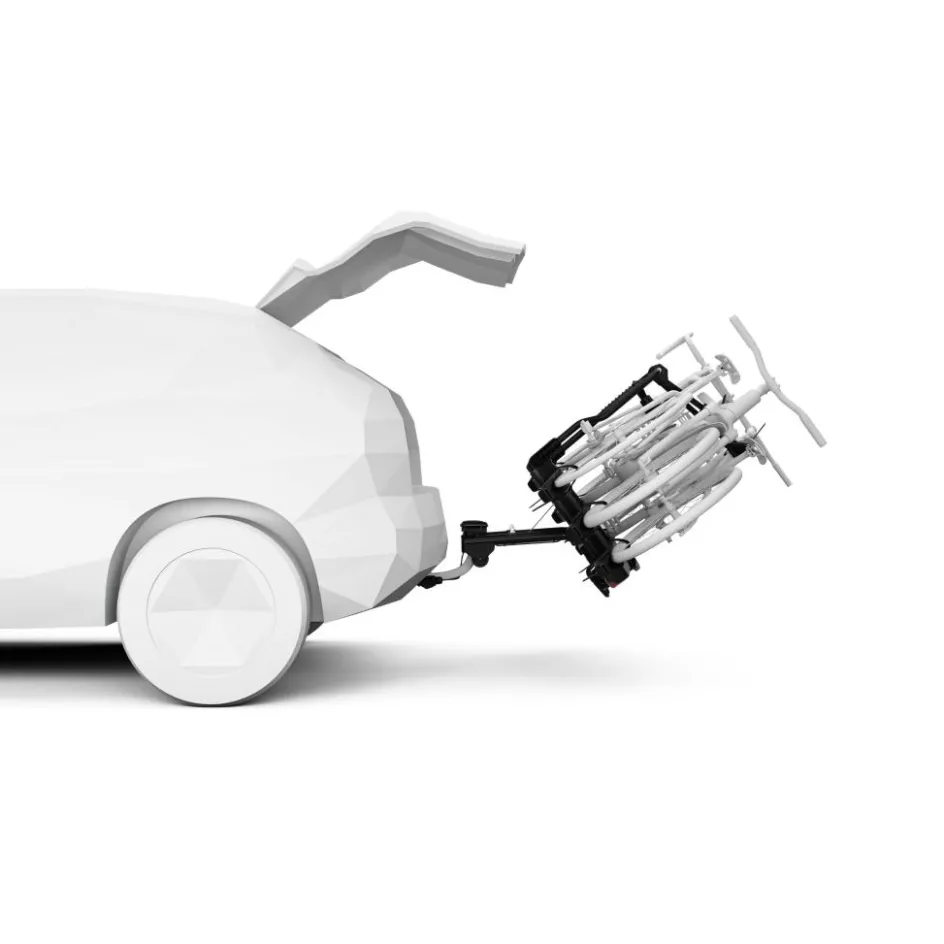 Het strakke ontwerp met geïntegreerde verlichting sluit perfect aan bij elke voertuigstijl. De ruime tussenafstand van 250 mm maakt het eenvoudig om grotere fietsen, zoals mountainbikes, te laden. Dankzij de slimme voetpedaalkantelfunctie blijft de kofferbak toegankelijk, zelfs wanneer de fietsen al gemonteerd zijn. De zelfstabiliserende koppeling zorgt bovendien voor een snelle en stabiele bevestiging van de drager op de trekhaak.
