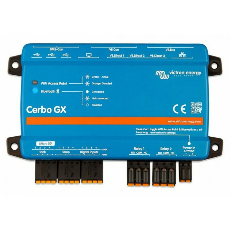 De Cerbo GX synchroniseert alle systeemcomponenten naadloos. Met uitgebreide aansluitmogelijkheden zoals 4 tank- en temperatuurpoorten, 3 VE.Direct-poorten, 3 USB-poorten, 4 digitale ingangen en 2 relais.