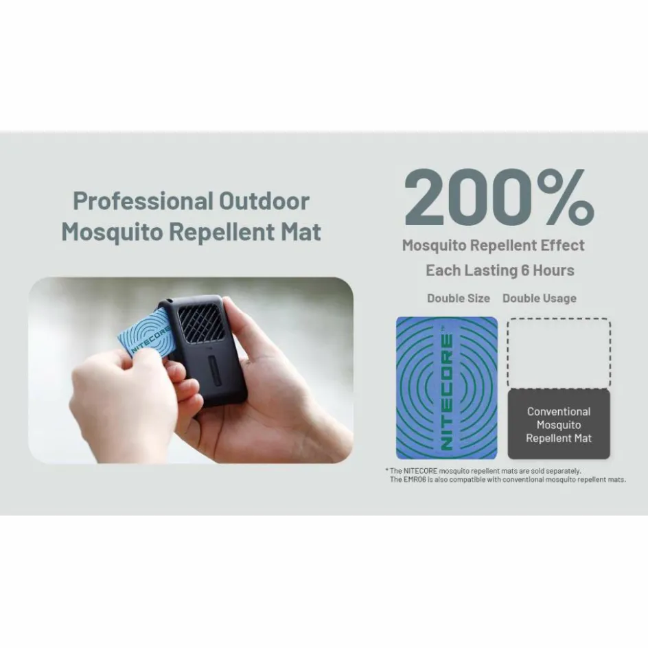 Deze NITECORE EMR06 muggenverjager is makkelijk overal mee naartoe te nemen, vanwege het lichte en kleine ontwerp. Deze NITECORE muggenverjager kunt u met het inbegrepen MOLLE bevestigingssysteem makkelijk aan een tas of rugzak bevestigen en u krijgt er een draagkoord bij. Deze EMR06 verjaagt muggen door muggenverjagende matjes te verwarmen met het vernieuwde FCB verwarmingssysteem. Binnen 10 minuten zijn alle muggen binnen een bereik van 4,9 meter verjaagd. De matjes gaan 6 uur lang mee en de Li-ion batterij werkt 3,5 uur voordat u deze weer op hoeft te laden met de USB-C kabel. De EMR06 kan een val tot 1,5 meter weerstaan en is bovendien IPX-5 waterdicht.