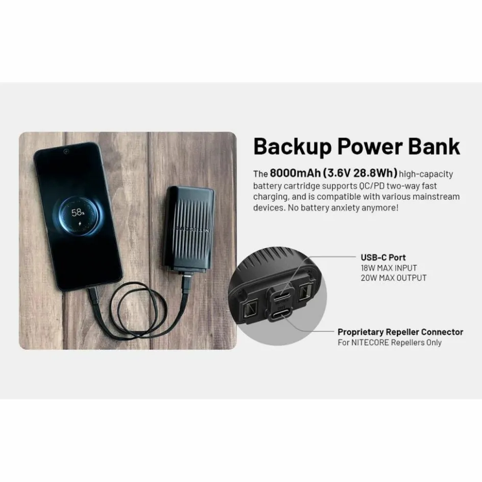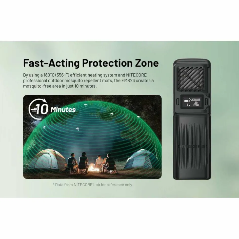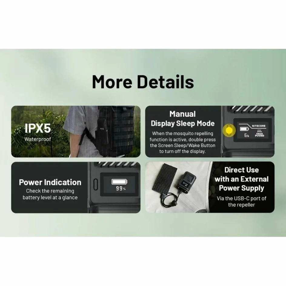 De Nitecore EMR23 creëert binnen 10 minuten een muggenvrije zone met een bereik tot 4,8 meter. Dat betekent dat u ongestoord kunt genieten van buitenactiviteiten, zelfs in gebieden met veel insecten. De EMR23 is uitgerust met een verwisselbare 8000 mAh batterij die ook te gebruiken is als powerbank voor het opladen van uw apparaten via USB-C. Op het OLED-display leest u eenvoudig de resterende gebruiksduur, modus en batterijstatus af. Dankzij het compacte ontwerp en de handige clip draagt u de EMR23 moeiteloos bij u tijdens het kamperen, wandelen of reizen.