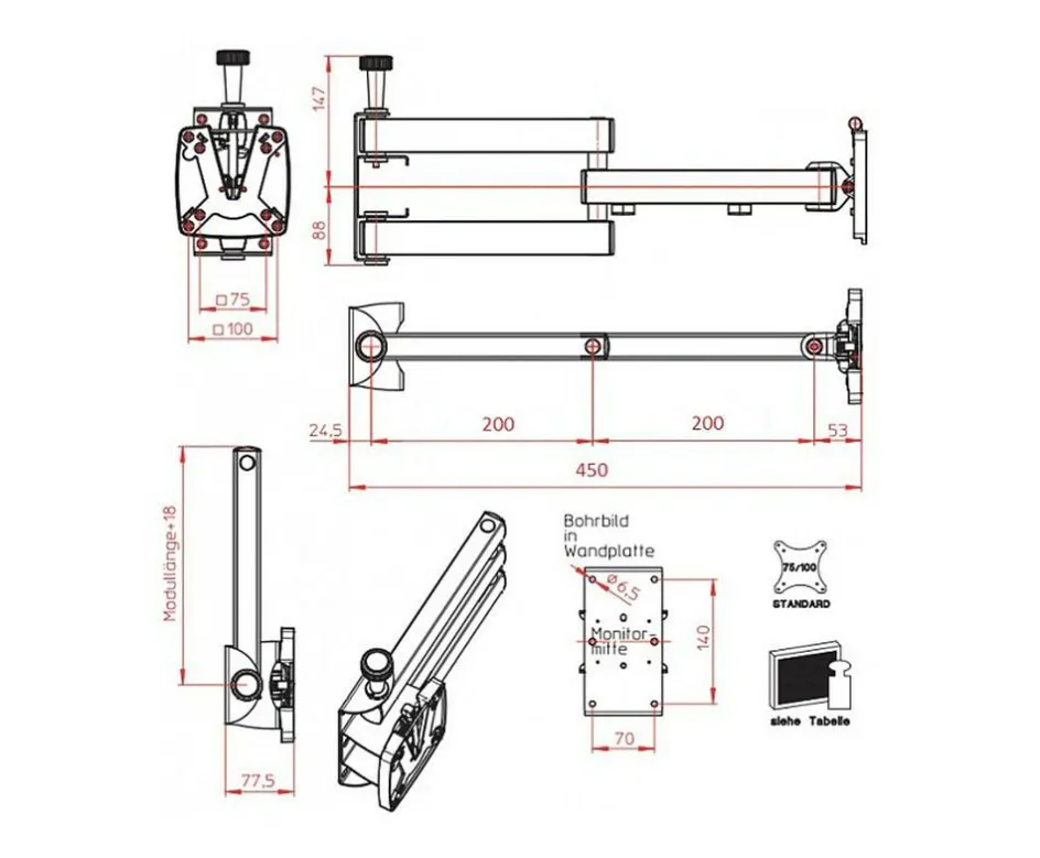 Dankzij de drie scharnierpunten van de wandsteun is het mogelijk om de tv zo plat mogelijk tegen de muur te draaien. Die draaipunten zijn tevens ook waarmee u de meest ideale kijkhoek instelt: de dubbele armen van de muurbeugel zijn horizontaal volledig 180° draaibaar. De bevestiging voor het scherm kan zowel naar voren als naar achteren gekanteld worden tot een hoek van 10°. De juiste hoek kan vervolgens vastgezet worden met de draaiknop.