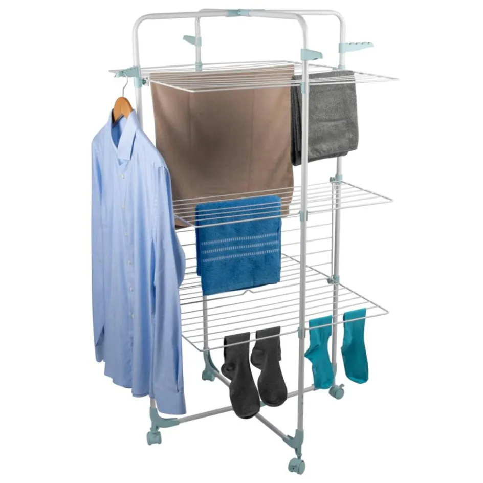 Het Alpina Droogrek is een licht maar stevig rek waar u meerdere ladingen wasgoed op kunt hangen. Het droogrek is 143 centimeter hoog en 68 centimeter breed. Het rek heeft 3 verdiepingen met 6 plateaus waar u genoeg kleding op kwijt kunt. Daarnaast bevinden er zich 4 haken aan de zijkanten om kledinghangers op te hangen. Is het rek eenmaal droog, klapt u hem eenvoudig plat en dankzij de 4 wielen rolt u hem gemakkelijk overal heen.
