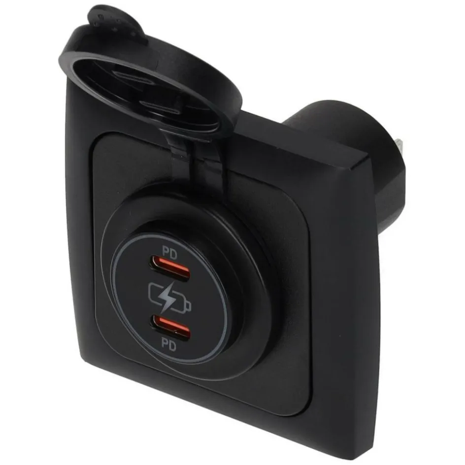 Deze Haba C-line lader wandcontactdoos is ontworpen voor campers, caravans en boten. Hij beschikt over twee USB C poorten met Power Delivery-technologie, die bij een 12 V aansluiting elk tot 36 W leveren (tot 60 W bij 24 V) en optimaliseert zo het opladen van smartphones, tablets en laptops. Dankzij het zwarte afdekraam en compacte ontwerp past hij naadloos in vrijwel elk interieur. Installatie is eenvoudig en gelijktijdig opladen van twee apparaten is mogelijk wat ideaal is voor onderweg.