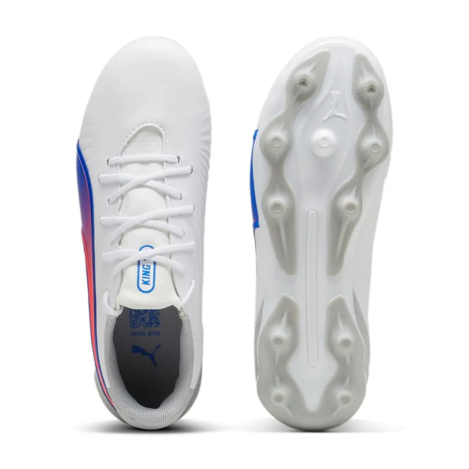 Deze PUMA KING MATCH FG AG voetbalschoenen voor kinderen hebben een bovenwerk dat voor 50% uit gerecycled materiaal bestaat. Dankzij de stevige TPU buitenzool met conische noppen zijn deze schoenen geschikt voor zowel vaste als kunstgras ondergronden.