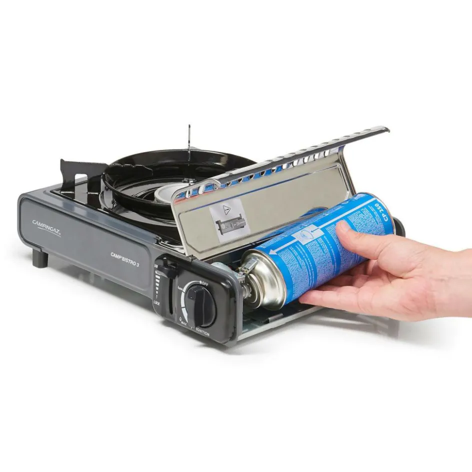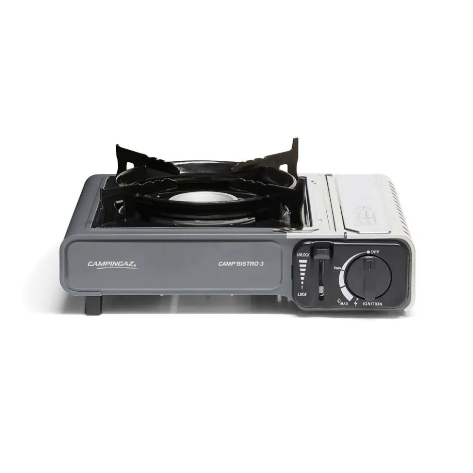Koken gaat eenvoudig met het stevige Camp Bistro 3 kooktoestel van Campingaz. Dit 1-pits Campingaz kooktoestel is uitgerust met een verbeterde pandrager die zorgt voor een goede stabiliteit. Daarnaast is de cartouchehouder, voor extra veiligheid, uitgevoerd in roestvrijstaal en beschikt dit gaskooktoestel over de mogelijkheid om de gastoevoer eenvoudig te onderbreken. Het vermogen kan helemaal naar eigen wens ingesteld worden met behulp van de draaiknop. De geïntegreerde piëzo ontsteking zorgt ervoor dat de brander eenvoudig en snel aan te steken is. Rond de brander van dit kooktoestel zit een speciale ring die voorkomt dat de brander door de wind wordt uitgeblazen. Vervoeren en opbergen kan in de meegeleverde kunststof draagtas.