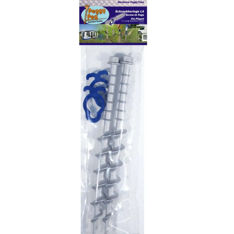 Met deze aluminium schroefharing van Peggy Peg kunt u zware tenten, grote partytenten of zelfs uw tuinmeubelen aan de grond vastzetten. De schroefharing wordt ook geleverd met een bijpassende haak die door het ontwerp van de schroefharing de aangrijphoogte kan aanpassen. Hierdoor kunnen gemakkelijk extra stormlijnen worden bevestigd. De set bestaat uit 2 stuks schroefharingen met 2 bijpassende haken.