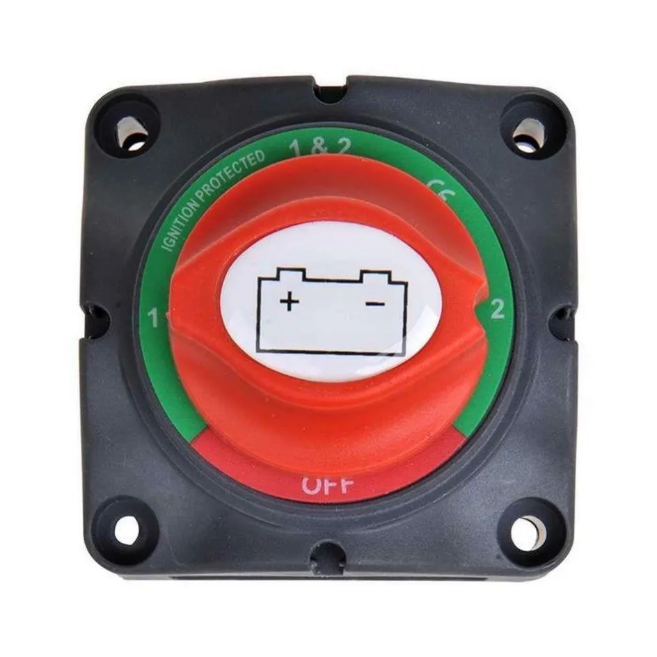 De ProPlus hoofdstroomschakelaar voorkomt dat de accu leegloopt bij langdurig stilstaan. Deze schakelaar heeft 4 verschillende standen die geschikt zijn voor een 12V tot 48V systeem. Stand 1 stuur alleen stroom naar uitgang 1 en stand 2 stuurt alleen stroom naar uitgang 2. Bij stand 3 wordt er zowel stroom naar 1 als 2 gestuurd en bij stand 4 is het stroomcircuit afgesloten.