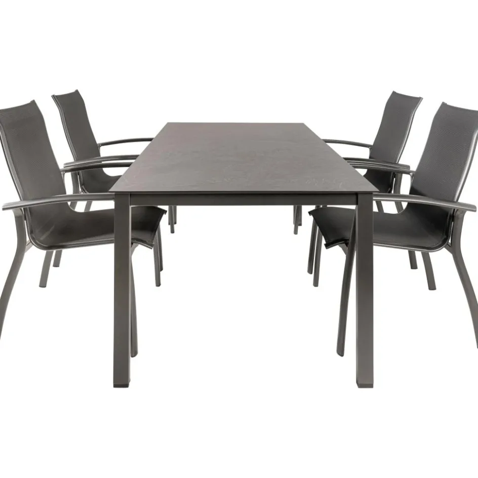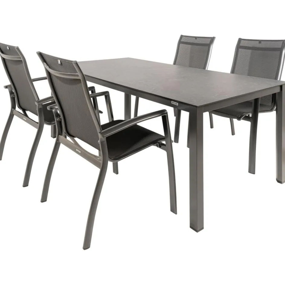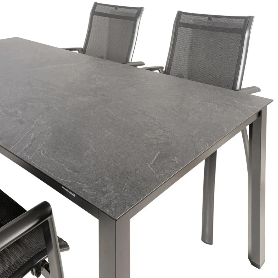 De Kettler HPL 180 Legato 4 verstelbaar tuinset jura antraciet omvat een HPL tuintafel en vier stapelbare Legato tuinstoelen. De tafel is vervaardigd van High Pressure Laminate met een aluminium onderstel, biedt duurzaamheid, eenvoudig onderhoud en een modern, licht ontwerp. De tafel is weer- en UV-bestendig voor langdurige kwaliteit. De Legato tuinstoelen zijn stapelbaar en gemaakt van aluminium met een textileen zitting en rugleuning. Ze zijn weer- en UV-bestendig en onderhoudsvriendelijk, ideaal voor comfortabel en praktisch buitengebruik.