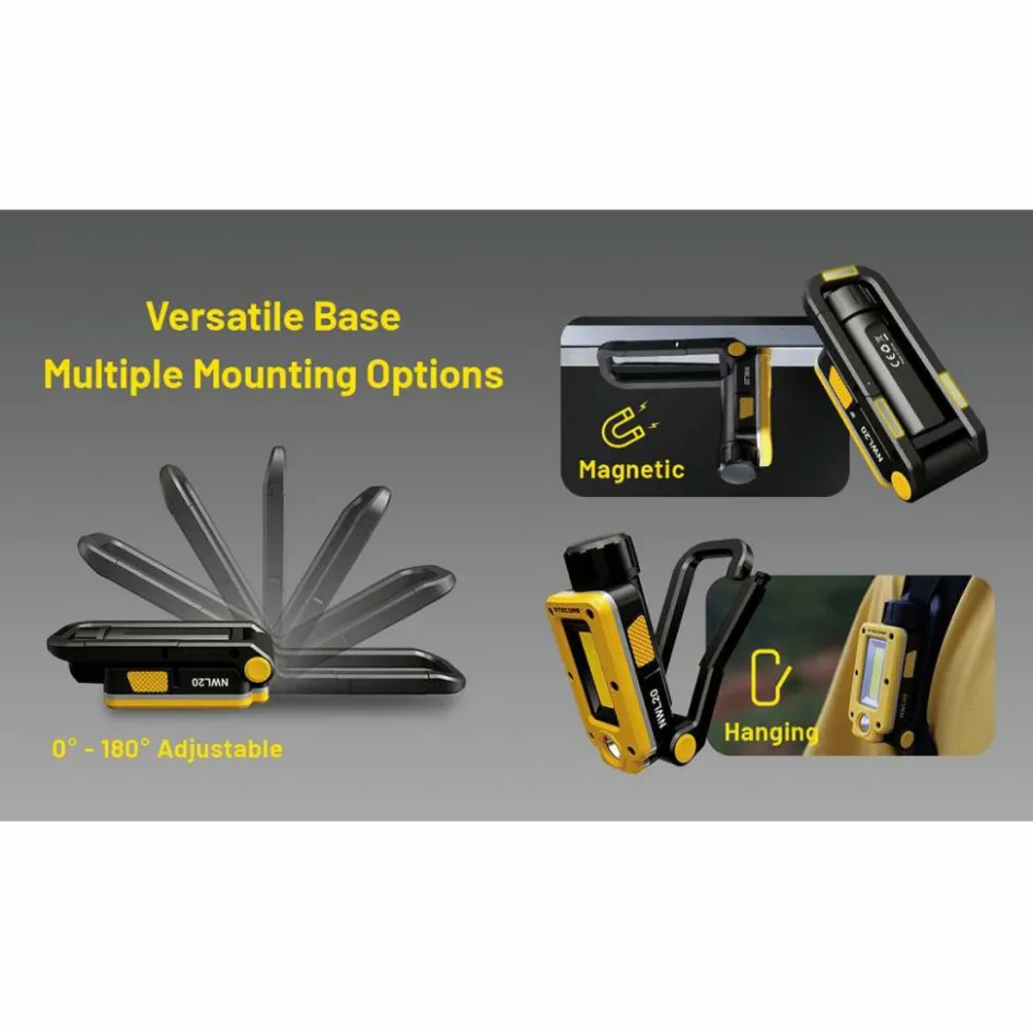 De Nitecore NWL20 werklamp heeft een maximale output van 600 lumen en combineert een brede COB-gloed met een gerichte spotlight. Dat betekent dat u zowel een complete werkruimte kunt verlichten als details op korte afstand zichtbaar maakt. De werklamp is voorzien van een magnetische achterzijde, verstelbare standaard en ophanghaak, zodat u hem eenvoudig handsfree kunt gebruiken in elke situatie. Ook kunt u snel het resterende batterijniveau aflezen. De lamp wordt geleverd met een USB-C oplaadbare batterij van 5000 mAh met een accuduur van 6 tot 78 uur, afhankelijk van de lichtsterkte. Bovendien is de Nitecore NWL20 werklamp valbestendig tot 1 meter en waterdicht volgens de IPX5-norm.