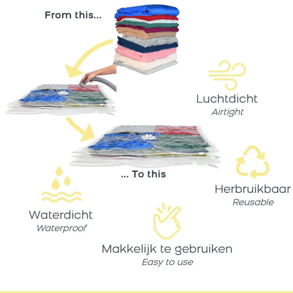 Met de Vacuüm opbergzakken van Space Buddy bergt u gemakkelijk diverse items op zoals beddengoed, seizoenskleding, kussens etc. Met deze zakken creëert u op een handige manier extra ruimte in uw kast. Bovendien worden uw spullen beschermd tegen stof, verkleuring, schimmel, vocht en insecten.