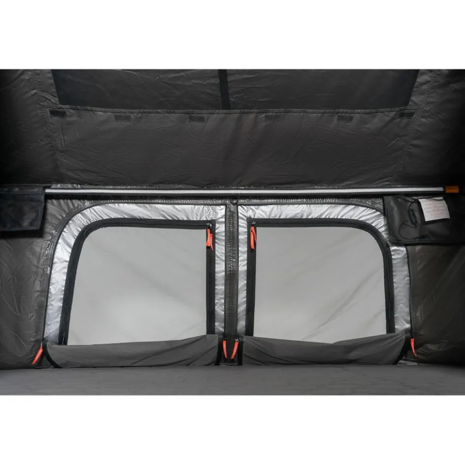 - Compact op het dak: ingeklapt 218 x 152 x 25 cm – laag profiel voor stiller rijden. Open 218 x 152 x 145 cm voor aangenaam zit- en leefcomfort.