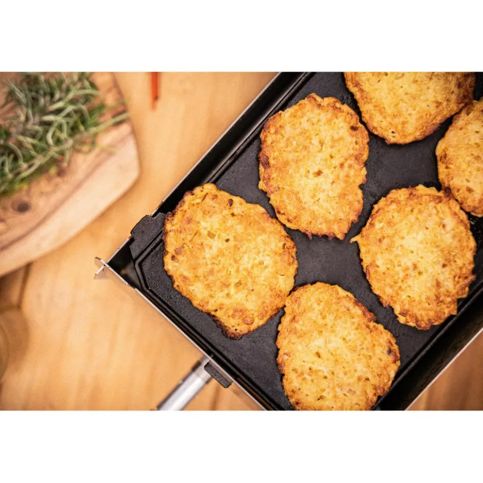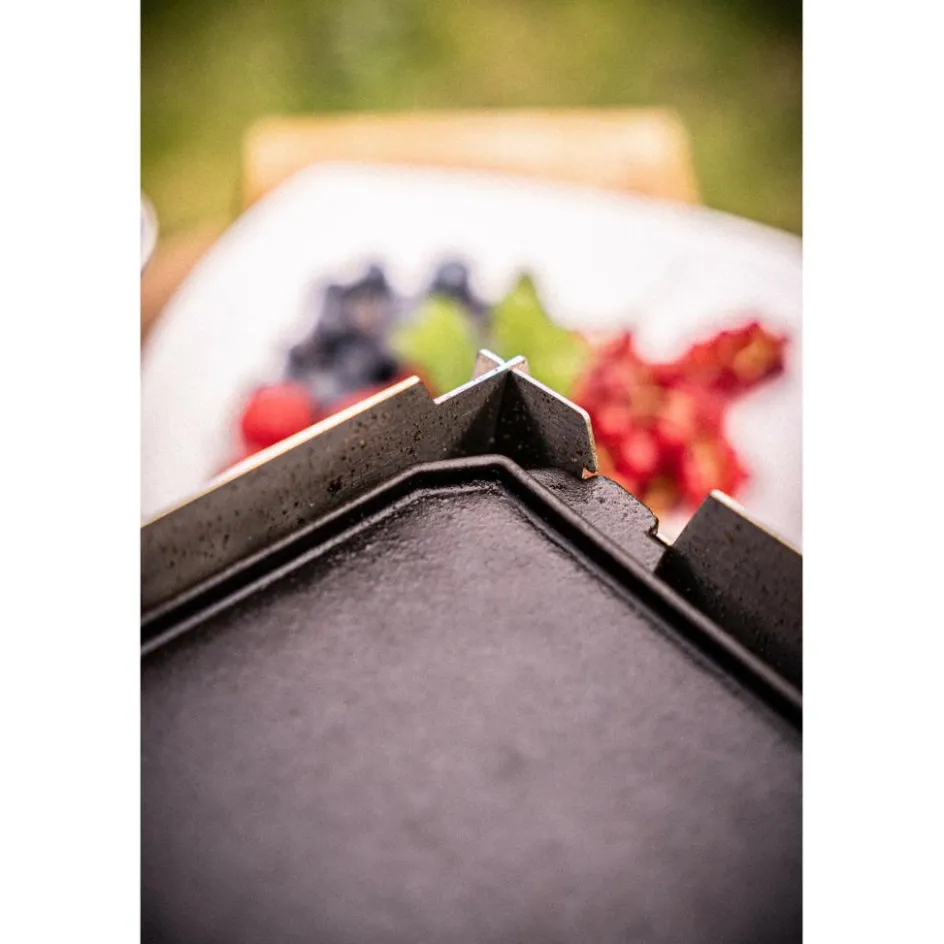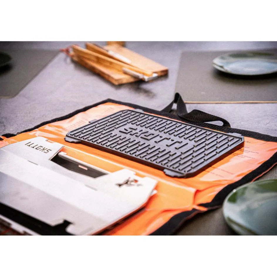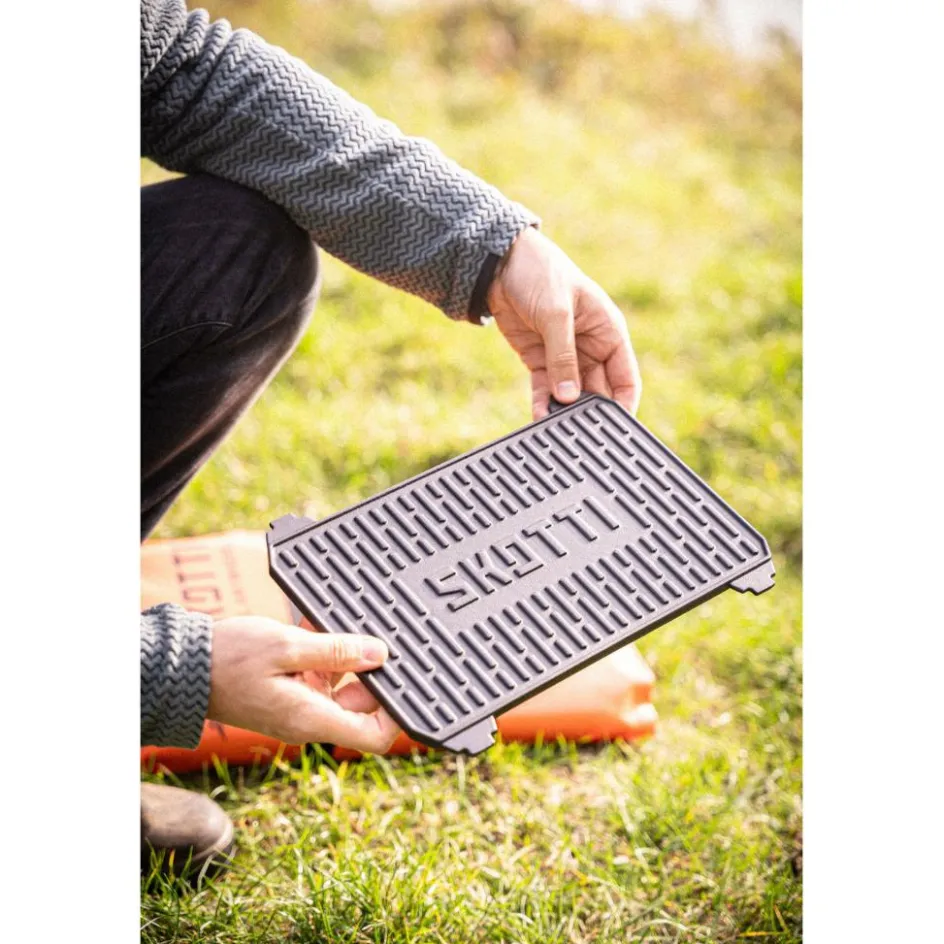De SKOTTI KAST grillplaat heeft twee verschillende kanten. Aan de ene kant van deze SKOTTI grillplaat zitten groeven, perfect voor het grillen van vlees en vis. De andere kant is glad, zodat u hierop een eitje of pannenkoek kunt bakken. Deze grillplaat is volledig gemaakt van gietijzer, dat de warmte goed vasthoudt. U hoeft deze grillplaat simpelweg op uw SKOTTI barbecue te leggen en u kunt heerlijk gaan grillen.