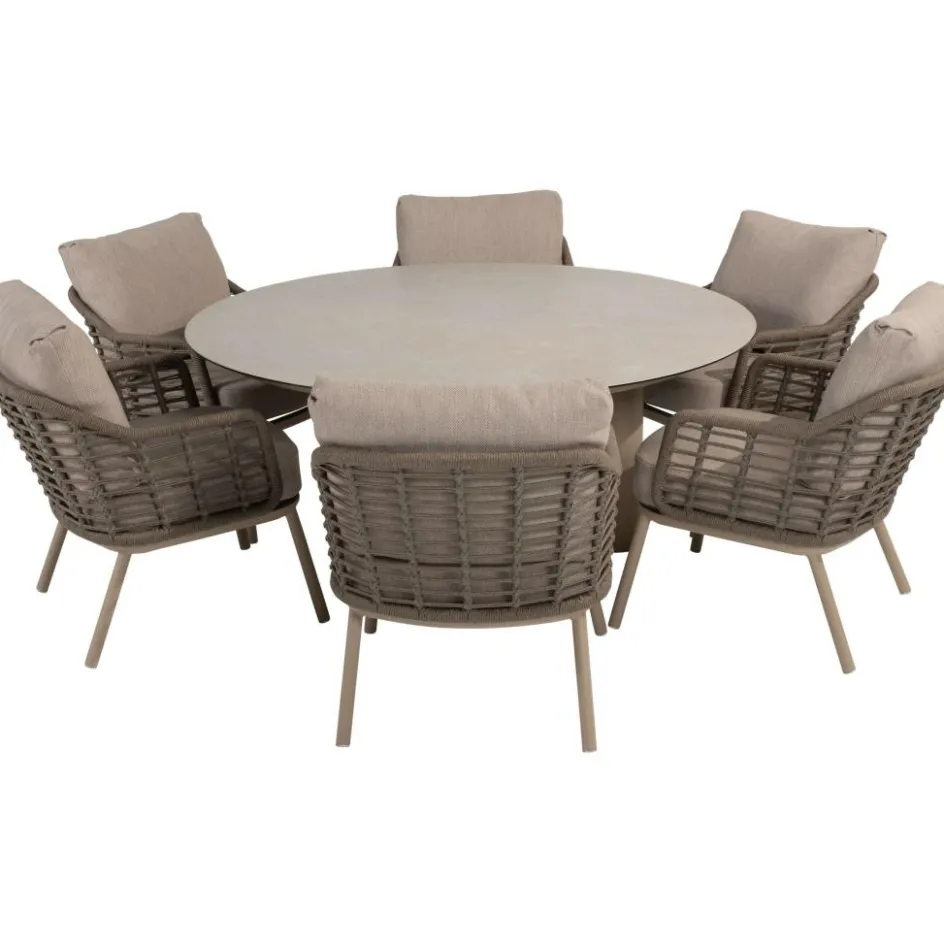De Taste by 4 Seasons Donato tuinset met Puglia stoelen biedt een goede balans tussen stijl, comfort en duurzaamheid. De zes Puglia tuinstoelen zijn vervaardigd uit hoogwaardige outdoormaterialen, waardoor ze langdurig bestand zijn tegen diverse weersomstandigheden. Het aluminium frame is voorzien van een latte-kleurige poedercoating. Het met de hand gevlochten taupekleurige rope vlechtwerk zorgt voor een verfijnde afwerking. Voor optimaal zitcomfort zijn de stoelen uitgerust met extra gevulde zit- en rugkussens, bekleed met weerbestendig en zacht Olefin-textiel. De set wordt compleet gemaakt door de Donato dining tuintafel, die met zijn ronde keramisch geprinte blad en drie stevige aluminium poten met latte poedercoating een luxe uitstraling heeft.